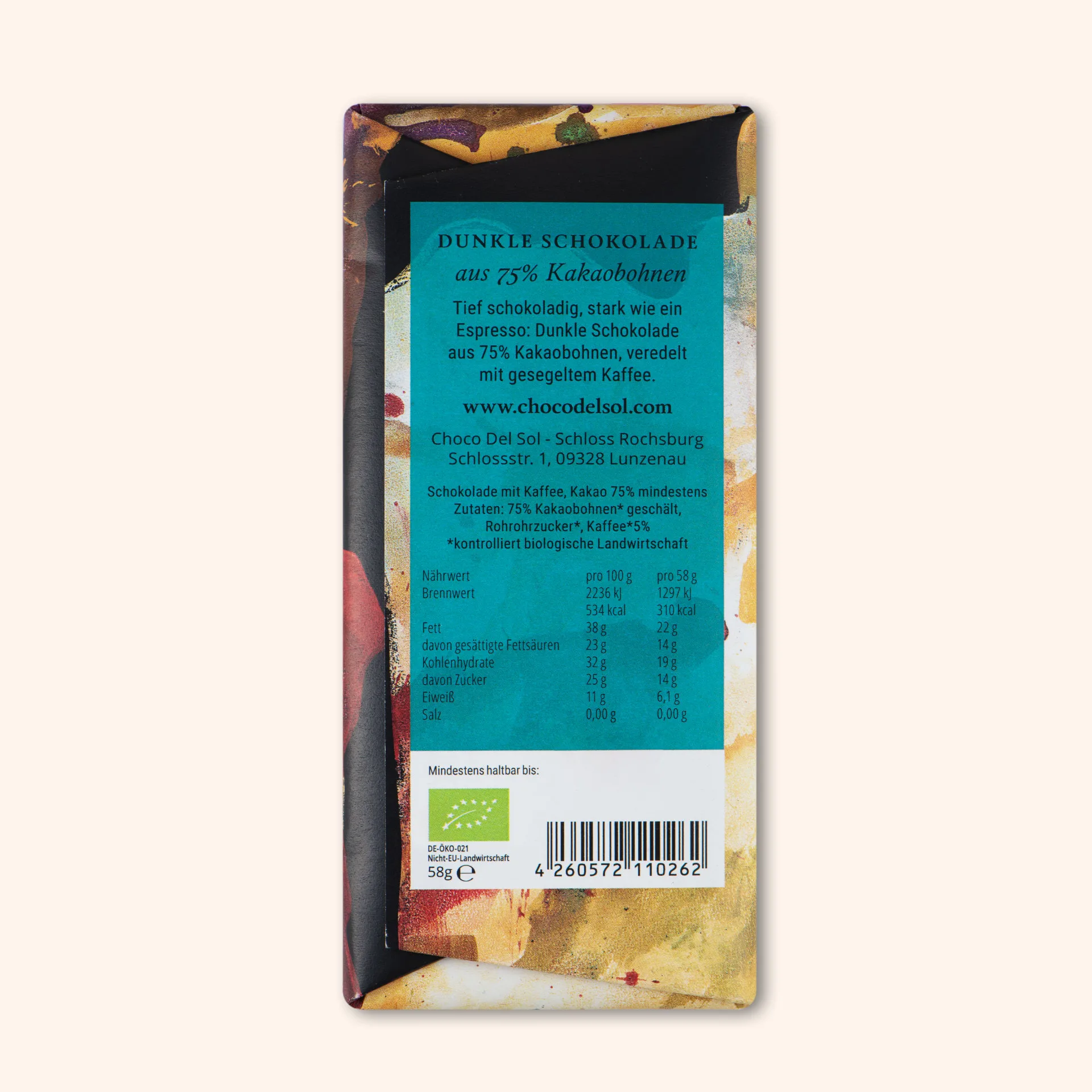 - Handgearbeitete, vegane Bio-Schokolade aus Premiumkaffee- und Kakaobohnen mit intensivem, espressoähnlichem Geschmack.