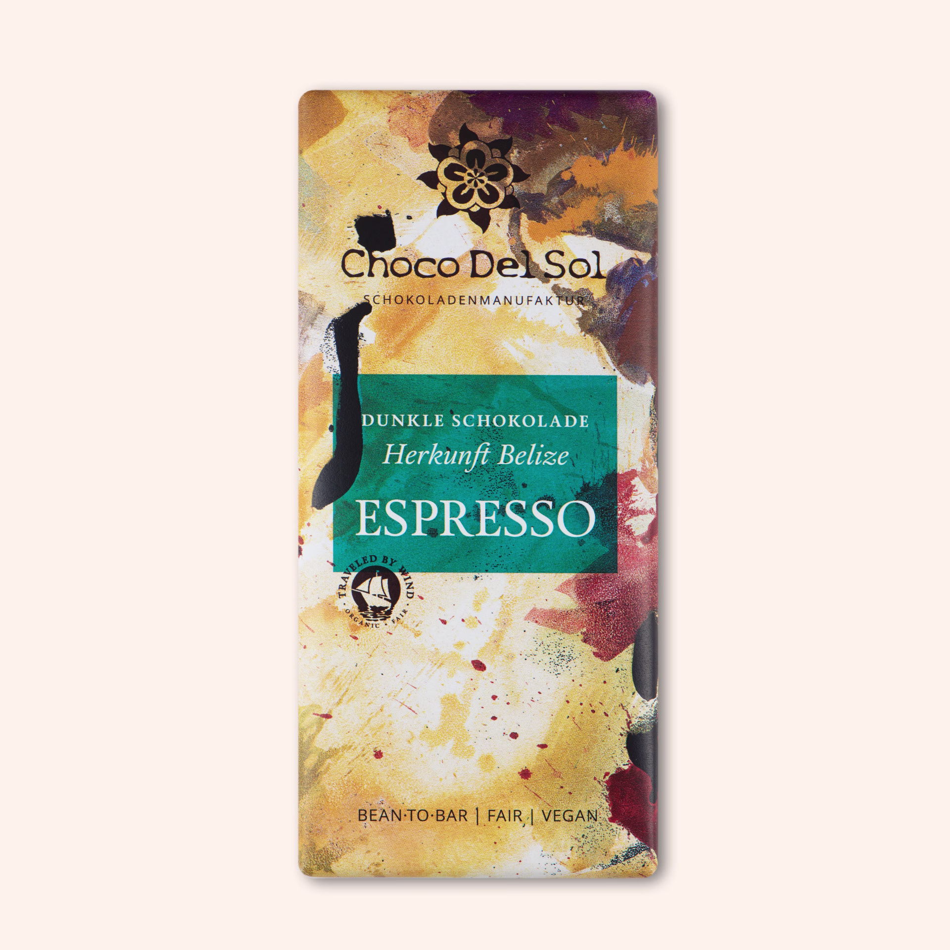Diese handgearbeitete, vegane Bio-Schokolade ist ein Muss für Kaffeefans. Hierfür verarbeiten wir beste Premiumkaffeebohnen zusammen mit Kakaobohnen zu einer glatten Schokolade. Tief schokoladig und stark wie ein Espresso – ein perfekt ausbalanciertes Geschmackserlebnis, das nicht nur Kaffeeliebhaber begeistert. Unsere »Espresso« ist rassig, intensiv und zugleich cremig. Wir achten besonders auf die Herkunft unserer Rohstoffe und beziehen unseren Kakao direkt von einer kleinen Bauern-Kooperative aus dem südlichen Belize. Diese garantiert uns biologischen Anbau, für den wir gern faire Preise bezahlen.