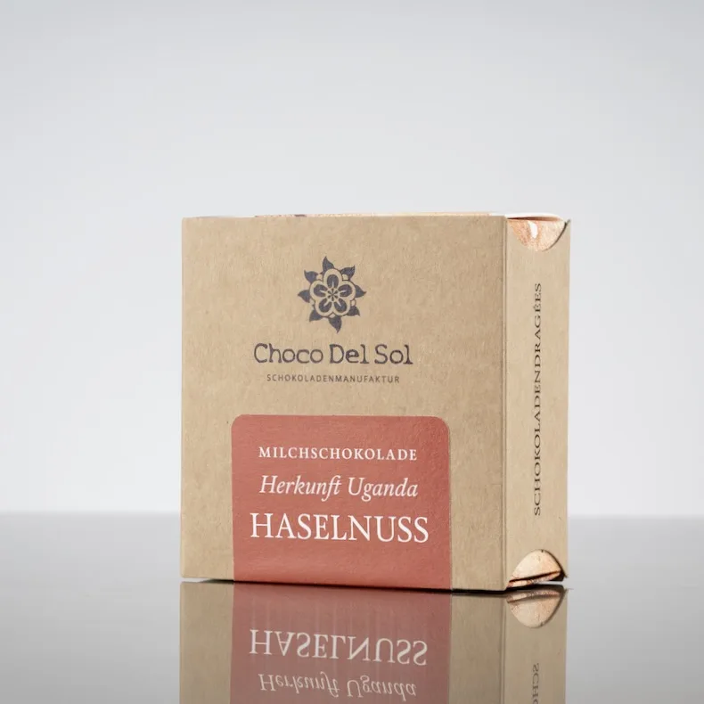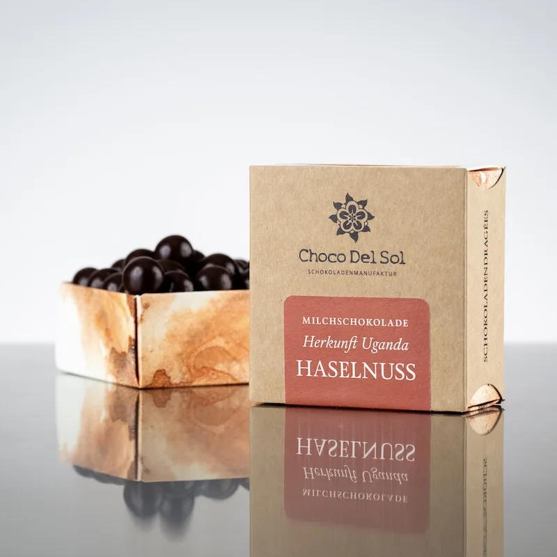 - Geröstete Bio-Haselnüsse werden von dunkler Milchschokolade aus ugandischem Kakao umhüllt.