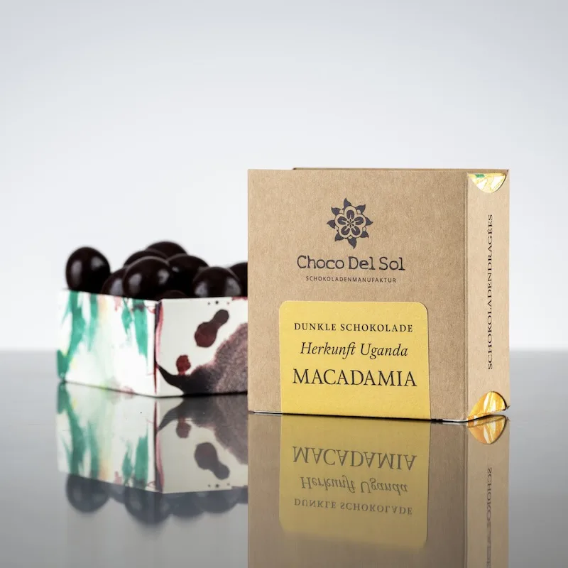 - Geröstete Bio-Macadamianüsse in dunkler Schokolade aus Uganda-Kakaobohnen.