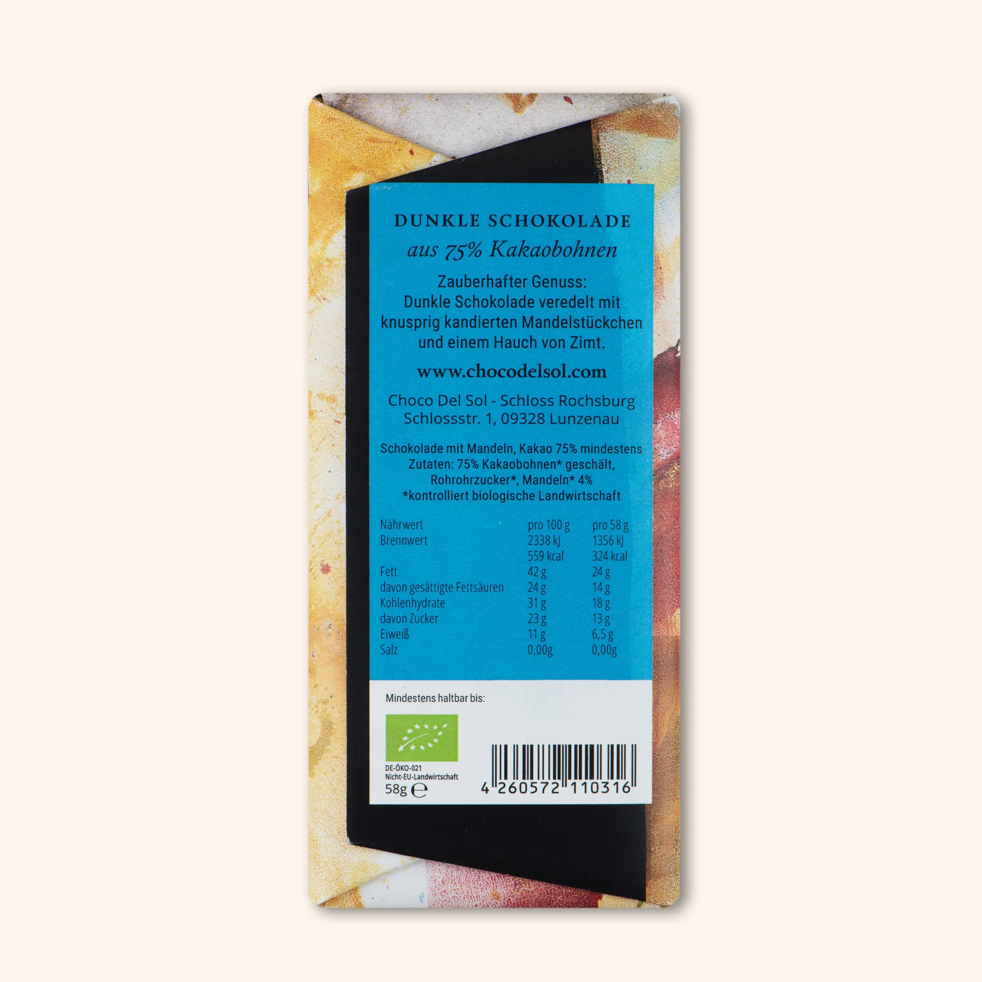 Aromatisch geröstete, gehackte Mandeln aus Mallorca werden mit einem Hauch von exotischem Zimt zu einem knusprigen Mandelcrunch gebrannt. Diese Komposition macht die 75%ig dunkle Schokolade zu einem knackigen Geschmackserlebnis. Die Intensität des Kakaos und die Süße der kandierten Mandeln sind ein süß-würziges Geschenk an Ihren Gaumen und erinnern verwöhnte Feinschmecker an klirrende, sonnige Wintertage. Wir achten besonders auf die Herkunft unserer Rohstoffe und beziehen unseren Kakao direkt von einer kleinen Bauern-Kooperative aus dem südlichen Belize. Diese garantiert uns biologischen Anbau, für den wir gern faire Preise bezahlen.