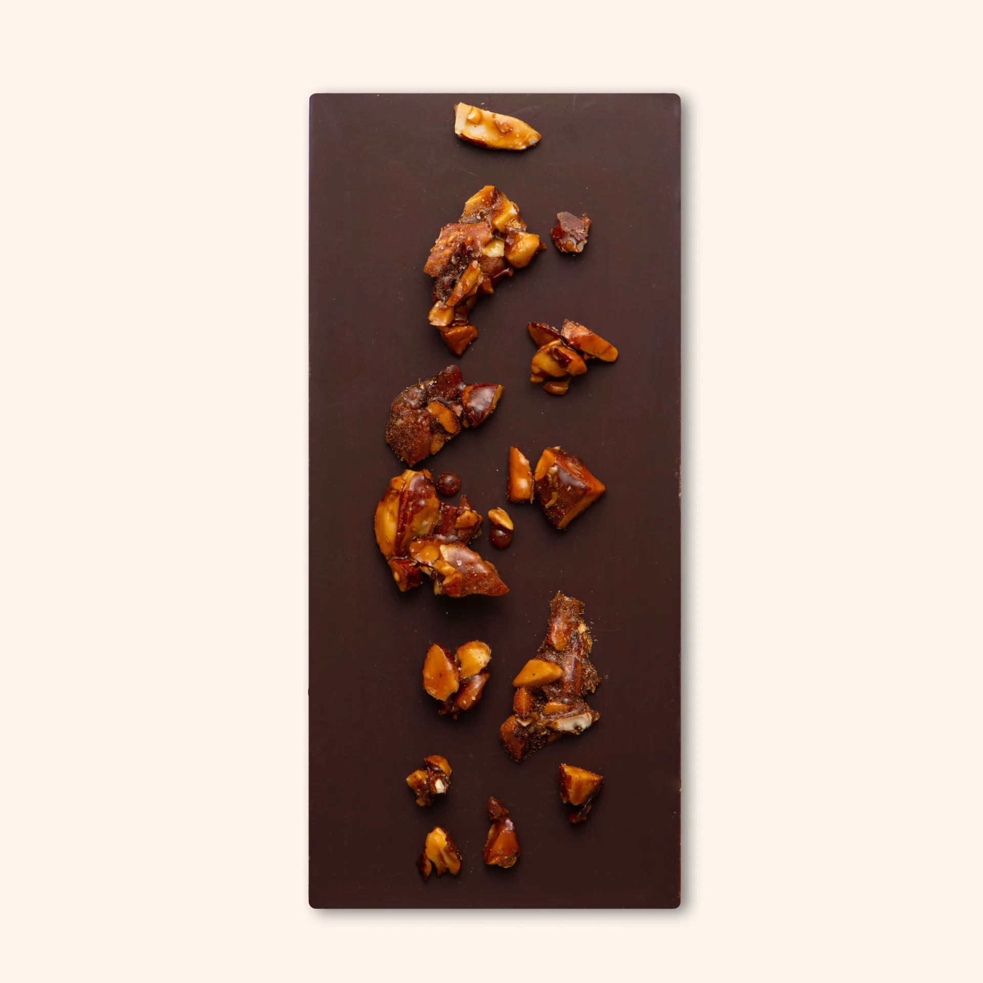 - Dunkle Schokolade (75 %) mit knusprigem Mandelcrunch aus gerösteten mallorquinischen Mandeln und einem Hauch Zimt.
